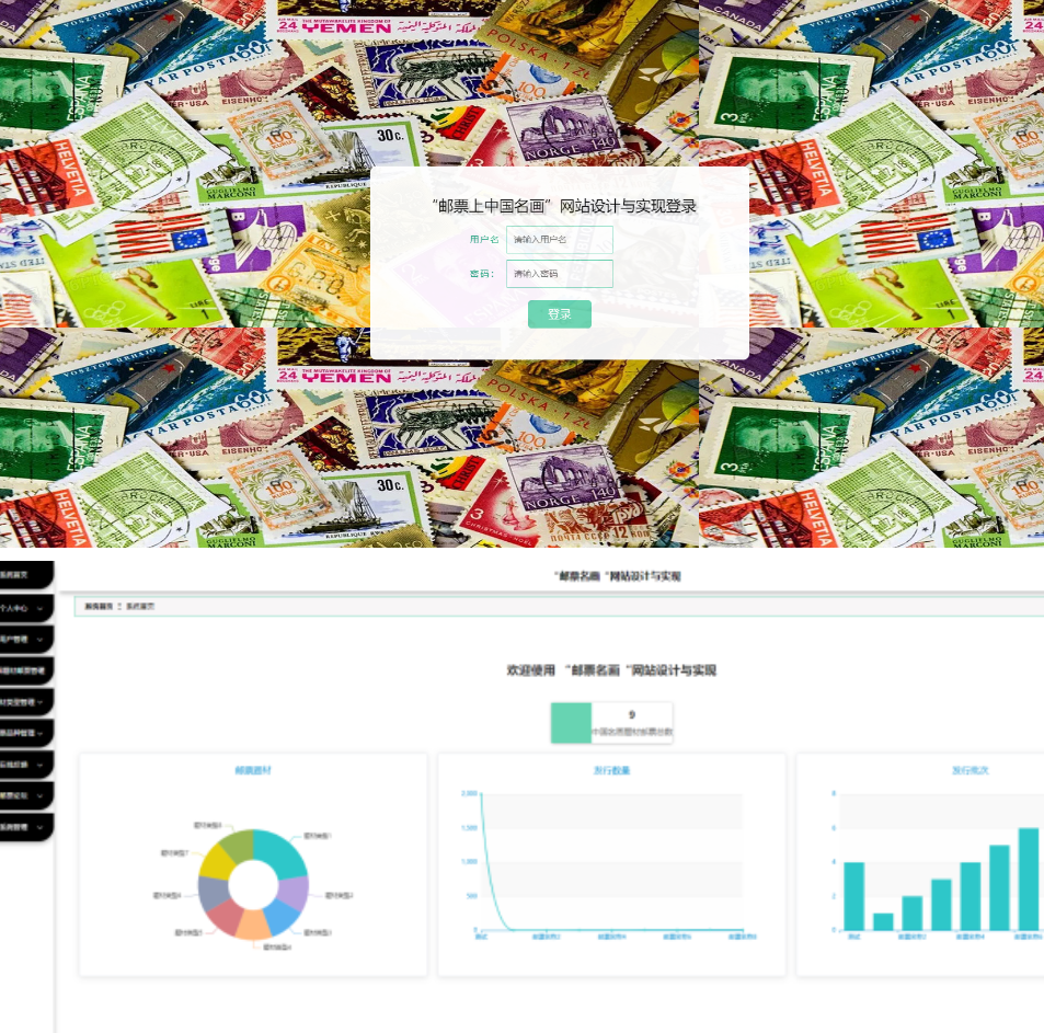 后台模快:首页、个人中心、用户管理、名画邮票邮票管理、题材类型管理、邮票品种管理、在线反馈、邮票论坛、系统管理