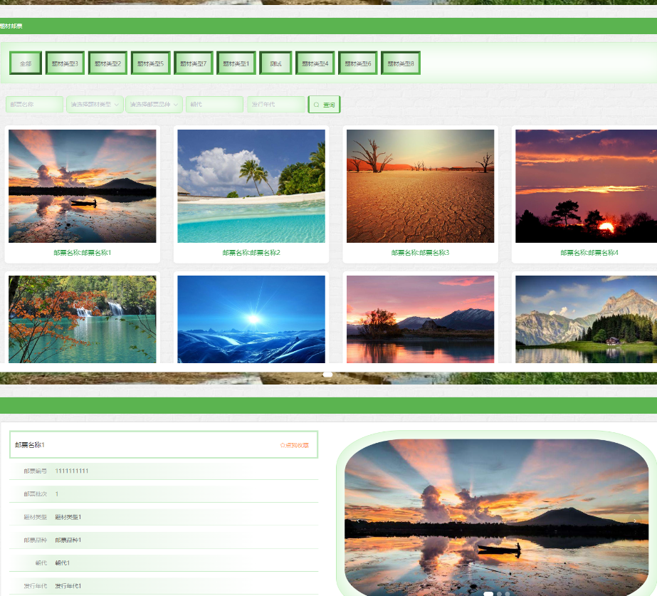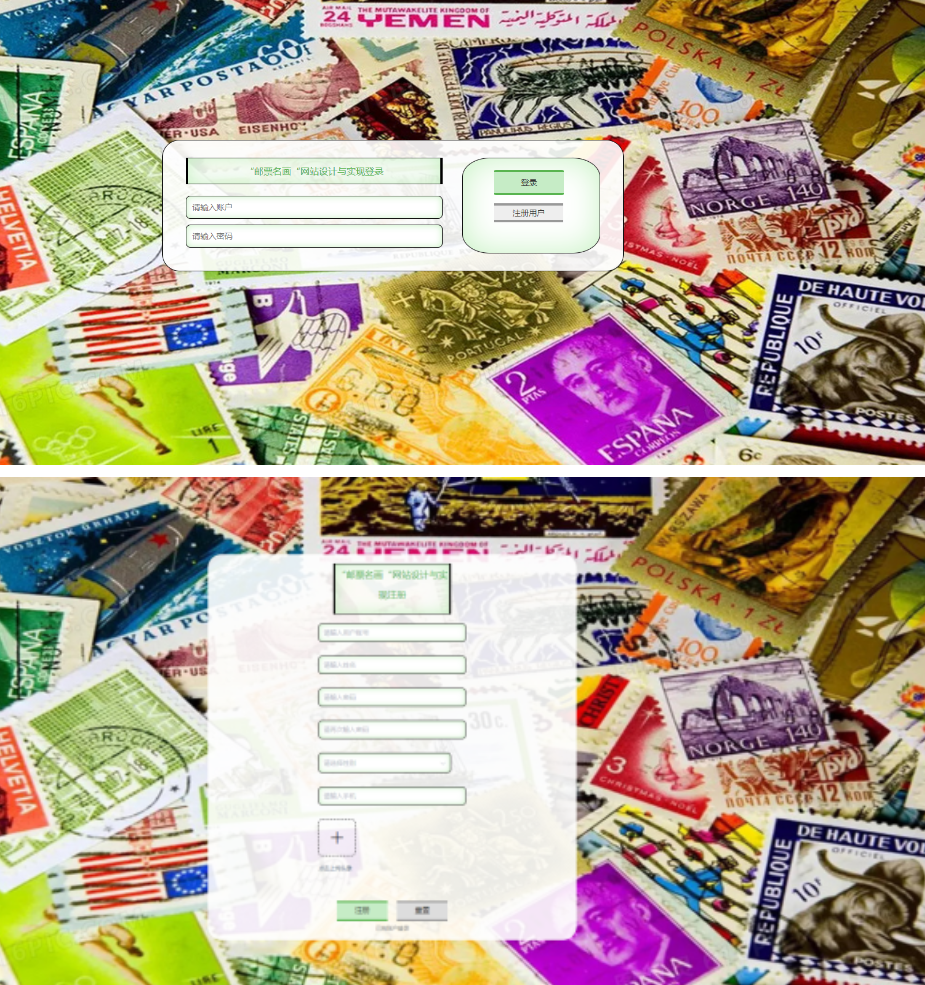 前台模快:首页、名画邮票、邮票论坛、邮票资讯、在线反馈、个人中心