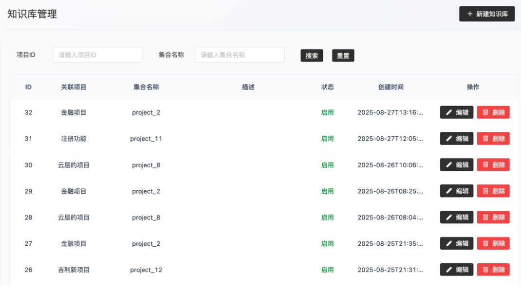 快速创建:无需繁琐配置,只需输入关联项目、集合名称及描述,一键生成知识库