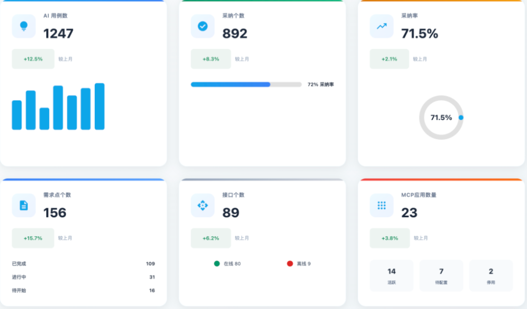 • 实时可视化看板:AI用例采纳率、需求覆盖率等12项核心指标动态呈现