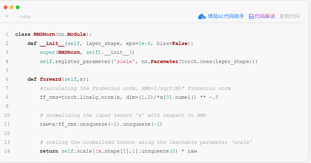 RMSNorm(Root Mean Square Normalization)层,这是一种用于深度学习模型(特别是 Transformer 架构)的归一化技术,旨在替代传统的 LayerNorm,以提高训练效率和稳定性。RMSNorm 的设计灵感来源于 Layer Normalization,但它进行了一定的简化: