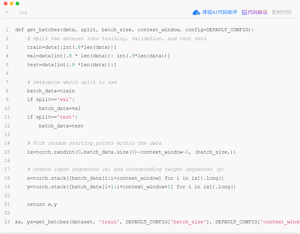 x对应的下一个字符序列,从索引i+1开始,长度同样为context_window。例如,如果输入是 “hello”,那么目标就是 "ello "(假设空格是下一个字符)。这种“输入-下一个字符”的关系是训练自回归语言模型的标准方式。