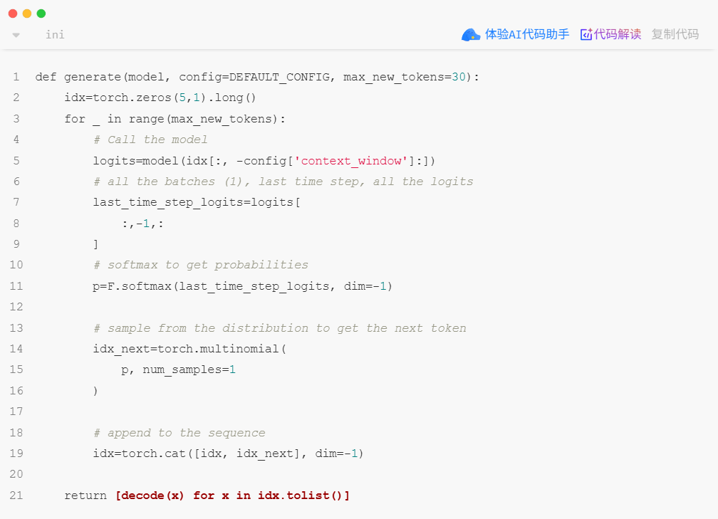 用于让一个预训练的语言模型生成文本。该函数遵循了自回归(autoregressive)生成的核心逻辑:每次生成一个新 token,并将其添加到序列中,然后使用新序列作为输入来预测下一个 token。
