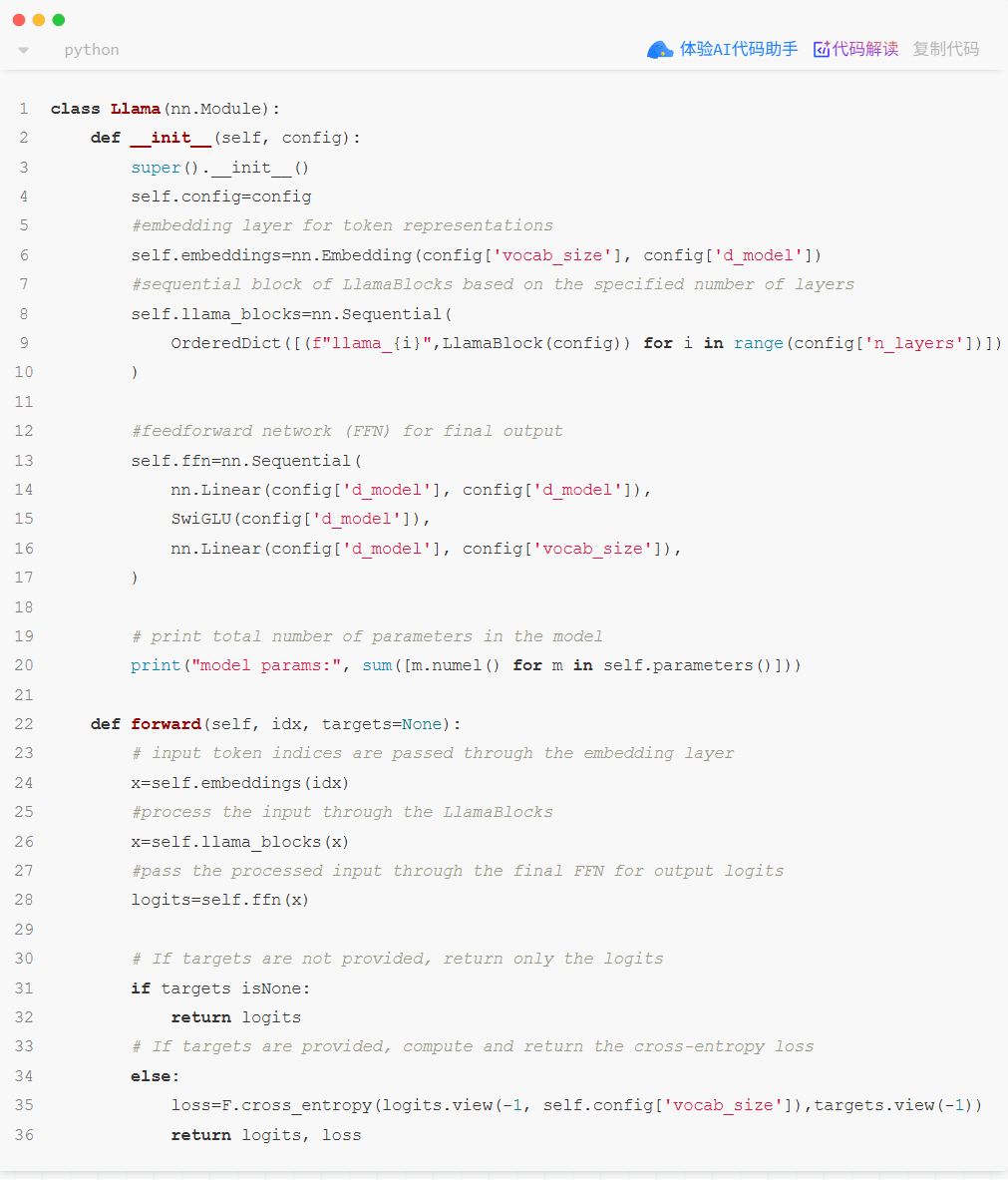 每个 Llama 块内部都包含了自注意力机制和前馈网络,用于捕捉和处理序列中的上下文信息。整个模型由三个主要部分构成:词嵌入层、一系列 Llama 块(即 Transformer 层)以及一个最终的输出层。