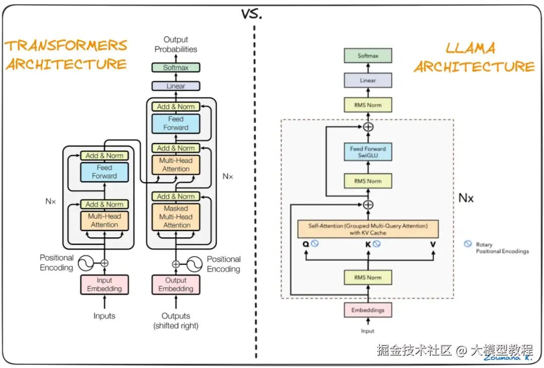 LLaMA 沿用了 Transformer 架构,但引入了几个关键的改进以提升性能和训练稳定性,这些改进借鉴了其他现有模型: