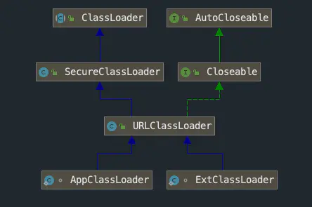 从图中可以看到类 AppClassLoader 和 ExtClassLoader 都继承 URLClassLoader, 而 URLClassLoader 又继承 ClassLoader, 在 ClassLoader 中有一个属性