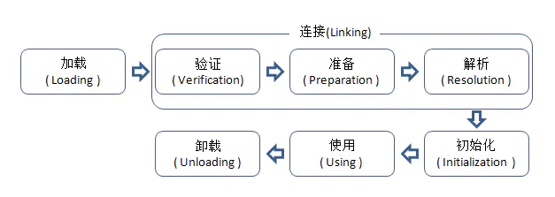 类从被加载到虚拟机内存中开始,到卸载出内存为止,它的整个生命周期包括:加载(Loading)、验证(Verification)、准备(Preparation)、解析(Resolution)、初始化(Initialization)、使用(Using)和卸载(Unloading)7个阶段。其中准备、验证、解析3个部分统称为连接(Linking)。如图所示