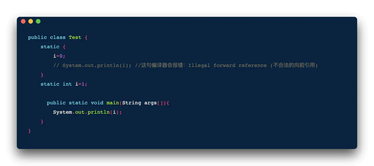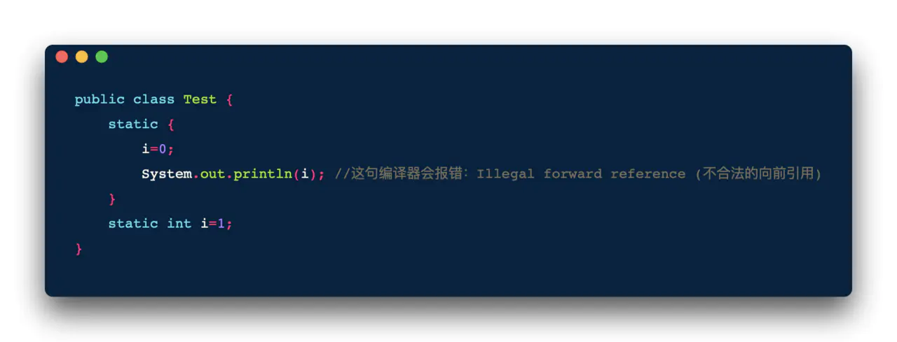 <clinit>()方法是由编译器自动收集类中的所有类变量的赋值动作和静态语句块 static{} 中的语句合并产生的,编译器收集的顺序是由语句在源文件中出现的顺序所决定的,静态语句块只能访问到定义在静态语句块之前的变量,定义在它之后的变量,在前面的静态语句块可以赋值,但是不能访问。如下: