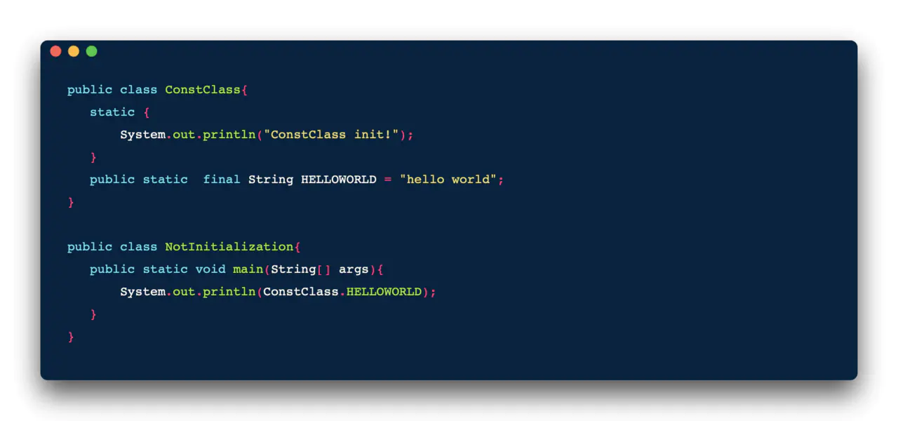 - 遇到 new, getstatic, putstatic, invokestatic 这些字节码指令时,如果类没有进行过初始化,则需要先触发其初始化。生成这4条指令的最常见的Java代码场景是:使用new关键字实例化对象的时候、读取或设置一个类的静态字段(被final修饰、已在编译器把结果放入常量池的静态字段除外)的时候,以及调用一个类的静态方法的时候。