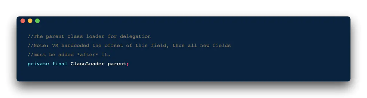 为什么呢?因为如果你去看ClassLoader类的源码时,你会发现,双亲委派的核心代码就是在这个方法中的;试想,你如果重写了这个方法,自然而然的就打破了双亲委派机制了。