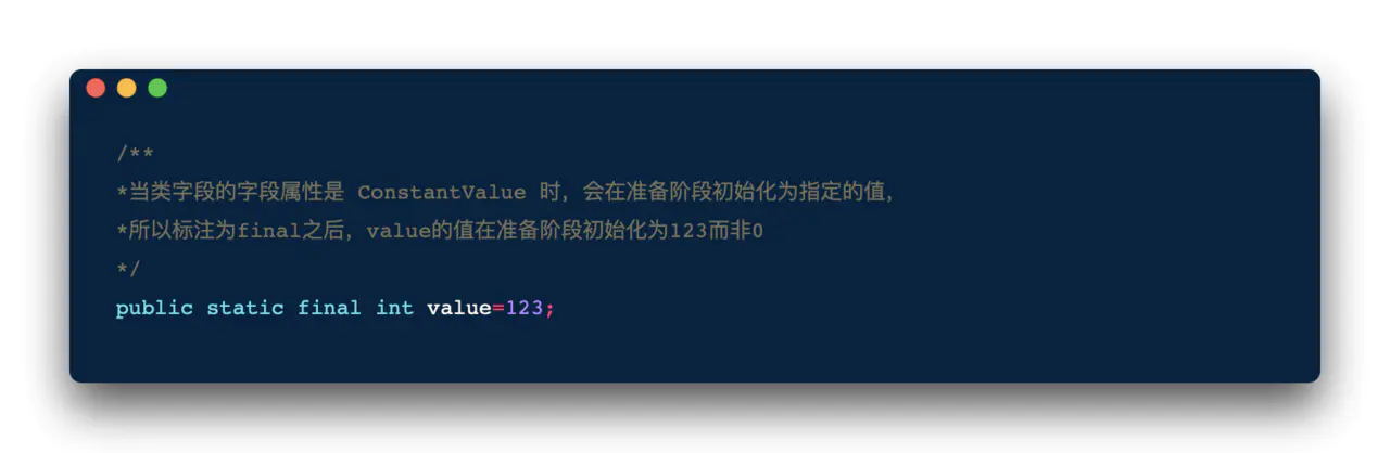 准备阶段是正式为类变量分配内存并设置类变量初始值的阶段,这些变量所使用的内存都将在方法区中进行分配。这时候进行内存分配的仅包括类变量(被static修饰的变量),而不包括实例变量,实例变量将会在对象实例化时随着对象一起分配在堆中。其次,这里所说的初始值通常情况下是数据类型的零值,假设一个类变量的定义为: