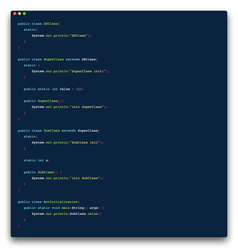 - 当初始化一个类的时候,如果发现其父类还没有进行过初始化,则需要先触发其父类的初始化。