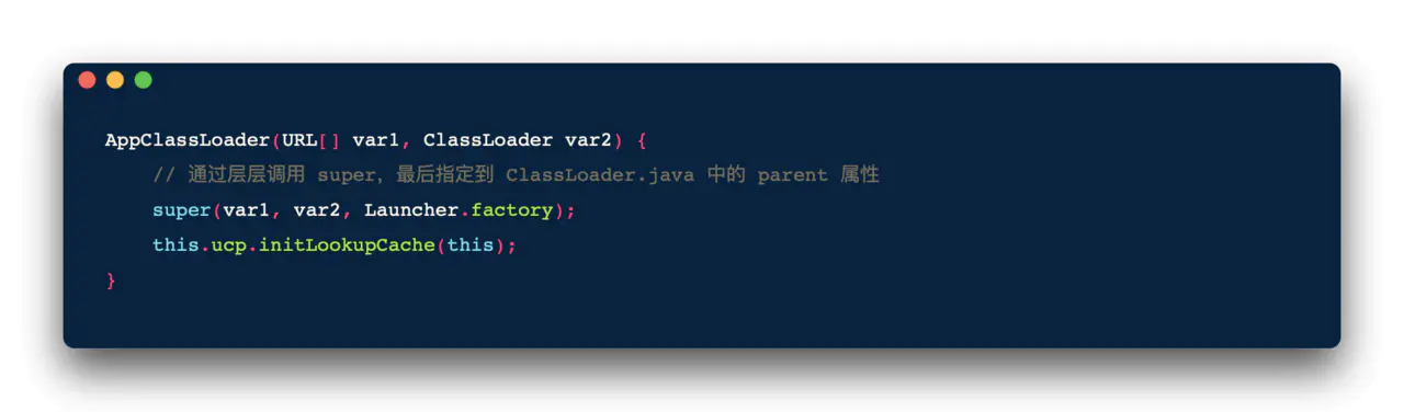 在通过构造函数实例化 AppClassLoader 和 ExtClassLoader 的时候都要传入一个 classloader 作为当前 classloader 的 parent