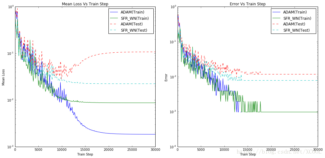The SFR network after the weight normalization is the “SFR_WN” mentioned in Figure 1, which obtains the lowest error rate in test samples. To observe whether this is a universal rule, I've elevated capacity of the experimental network to 4 hidden layers, and made comparative test against the conventional neural network using ADAM optimization algorithm. The Figure 3 shows the statistical results I have got in this experiment: