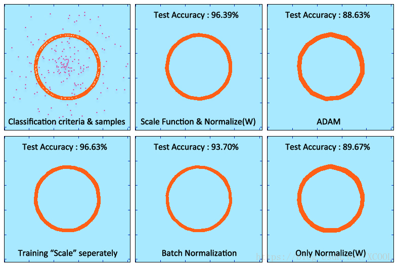 It is obvious that the experiment of the legend "ADAM" showed an “overfitting” problem in the final stage [8]. The generalization of the network labeled "SFR_WN" was stronger. Figure 4 draws the classification area trained by various methods in the experiment of a network of 5 hidden layers and its final accuracy in the test samples. In this experiment, we added three methods: using “Batch normalization”[9][10], using only normalized weights and using individual asynchronous training scale parameters, which will be mentioned later. In the experiment, I found that ADAM could not converge under strict L2 regularization. The test results using Batch Normalization was dependent on the setting of batch size [11], while SFR did not rely on these settings and worked perfectly.