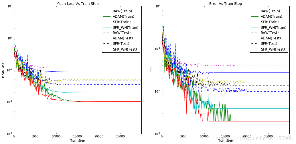 From Figure 1 we can see that the neural network with scale parameters converges quicker than the conventional neural network and makes less error in final classification. The convergence efficiency of SFR is close to that of ADAM. As for the test samples, less error was made in classification in SFR than that in ADAM. The networks that introduced in scale parameter and normalized neuron weights have fewer classification errors on test samples than all the others.