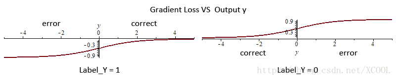 The experimental results showed that in a network with nonlinear scale function, choosing appropriate initial value and the super parameter for the scale function would obtain a higher accuracy rate on the test samples. To explain the mechanism that the scale function brings generalization ascension, let us have a review of SVM [13]. Although SGD is not equivalent to SVM, the samples that made classification errors can be considered as outliers. On the contrary, the correct classification samples can be considered as support vectors when the absolute value of the output is small. Essentially, The algorithm is the process of moving the neuron’s separating hyperplane close to the outlier or moving hyperplanes away from the support vector to enlarge the margin. Parameter adjustment is up to the gradient loss, Figure 5 shows the characteristics of the cross-entropy gradient loss for the two classification problems.