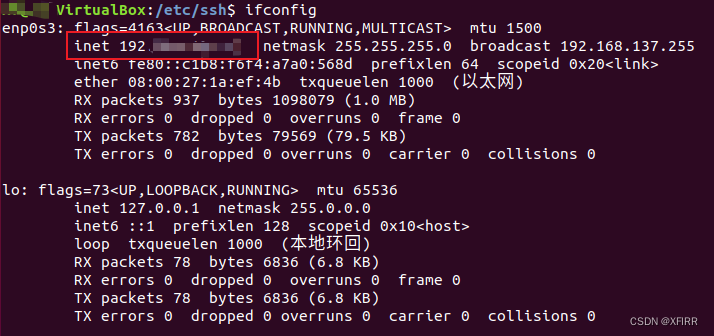 配置完成后直接启动虚拟机,打开终端,输入ifconfig命令,出现下图,红色方框的位置即为你的虚拟机的IP地址。