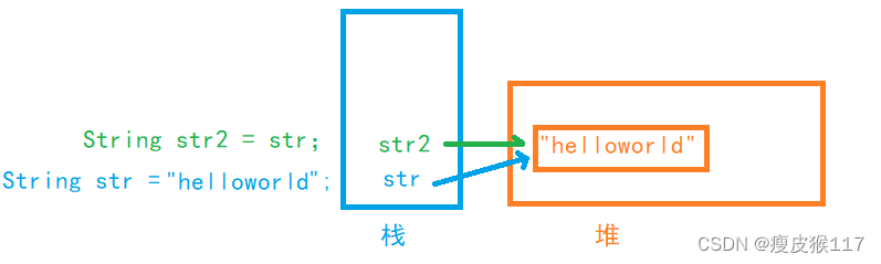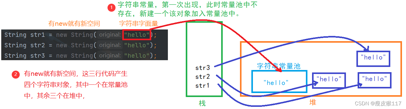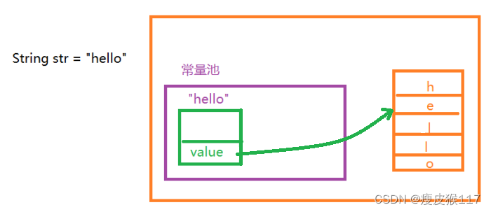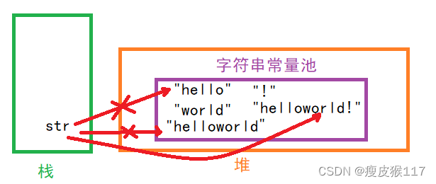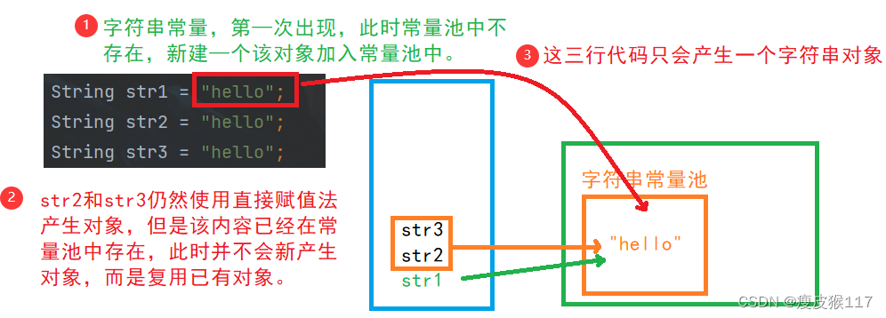 3. str2 = "hello"; 复用常量池中的"hello"。