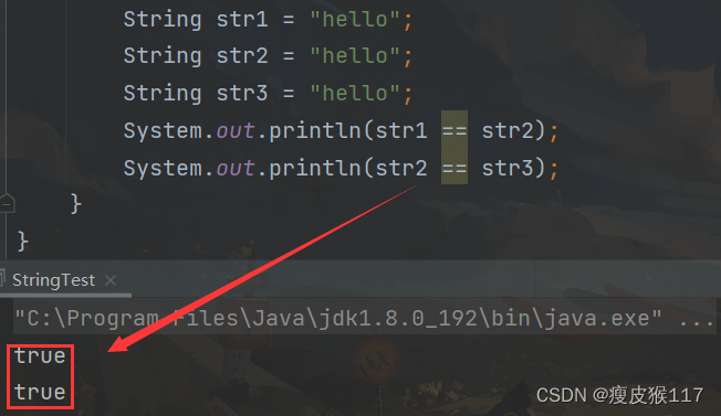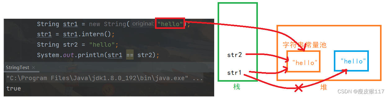 String str1 = "hello"; String str2 = "hello"; System.out.println(str1 == str2); //输出结果 true此处str1与str2并不是内容相同,只是说明str1和str2指向了相同的地址空间(原因在本文后续介绍)。