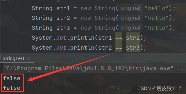String str3 = new String("hello"); String str4 = new String("hello"); System.out.println(str3 == str4); //输出结果 false此处相等证明了str3与str4的地址不同。