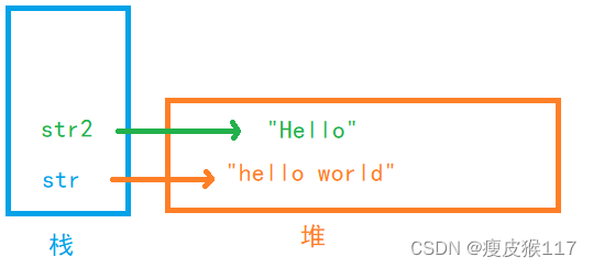 str1实际上指向了新的字符串对象"Hello",str仍旧指向原字符串对象"hello world"。