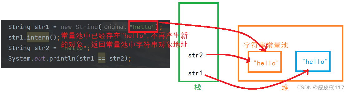 //str1指向堆中普通的字符串对象 String str1 = new String("hello"); str1.intern(); String str2 = "hello"; System.out.println(str1 == str2);答:false。