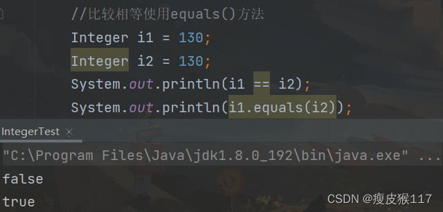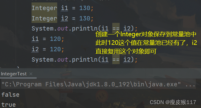 public static void main(String[] args) { Integer i1 = 130; Integer i2 = 130; System.out.println(i1 == i2); i1 = 120; i2 = 120; System.out.println(i1 == i2); }答:同字符串常量池。