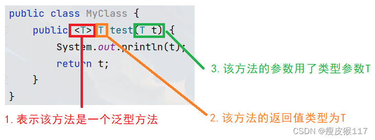 public class MyClass { public <T> T test(T t) { System.out.println(t); return t; } }