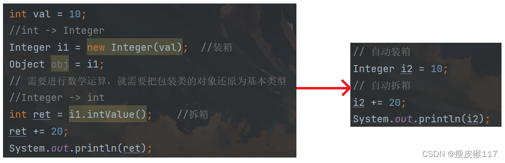 public static void main(String[] args) { int val = 10; //int -> Integer Integer i1 = new Integer(val); //装箱 Object obj = i1; // 需要进行数学运算,就需要把包装类的对象还原为基本类型 //Integer -> int int ret = i1.intValue(); //拆箱 ret += 20; System.out.println(ret); } //输出结果 30装箱:将基本类型的数值保存到包装类对象中。