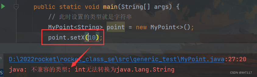 package generic_test; public class MyPoint<T> { // 此时x的类型不定,在产生这个对象时确定类型 private T x; private T y; public T getX() { return x; } public void setX(T x) { this.x = x; } public T getY() { return y; } public void setY(T y) { this.y = y; } public static void main(String[] args) { // 此时设置的类型就是字符串 MyPoint<String> point = new MyPoint<>(); point.setX("北纬10度"); point.setY("东经20度"); String x = point.getX(); String y = point.getY(); System.out.println("x = " + x + ", y = " + y); } } //输出结果 x = 北纬10度, y = 东经20度引入泛型后,可以在编译阶段检查设置的类型值是否是指定类型,若不一致,编译报错。