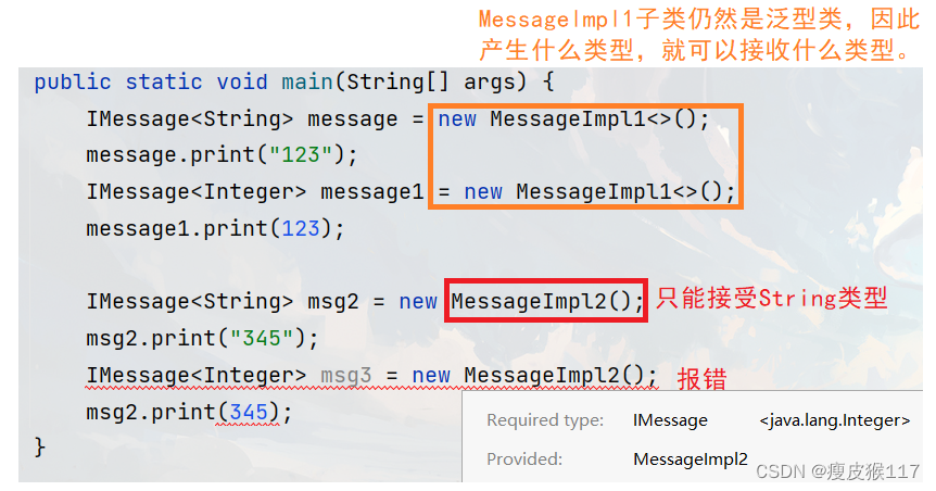 /** * 子类在实现接口时,继续保留泛型,子类也不清楚具体的类型 */ public class MessageImpl1<T> implements IMessage<T>{ @Override public void print(T t) { System.out.println(t); } }b. 子类明确当前类型