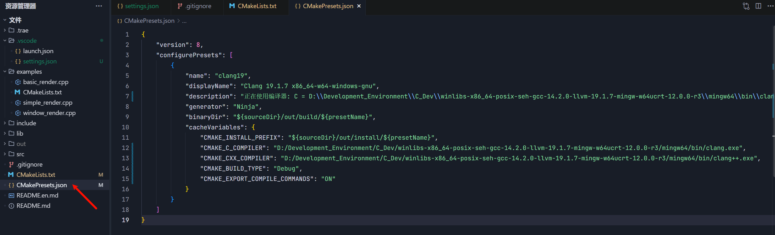 配置完成后会在项目路径下生成CMakePresets.json预设文件,根据自己环境情况配置c/c++编译器及生成工具