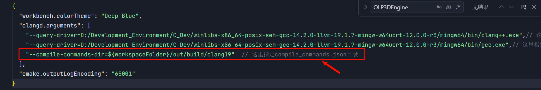 在vscode的设置文件settings.json中为clang指定编译配置命令的文件路径