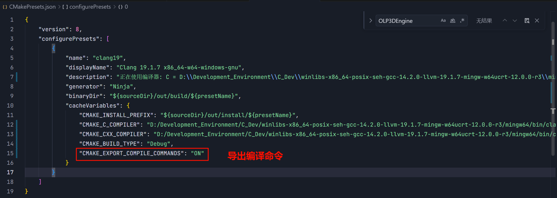 在cmake预设配置中打开导出编译配置命令,生成compile_commands.json文件