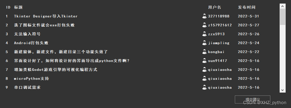 另外登陆后我们可以在‘建议反馈’那里提交建议与bug,因为TKinterDesigner上市时间也不长,所以bug是略微有一些多的