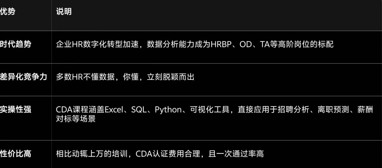 尤其是在这个大数据与人工智能快速渗透各行各业的时代,未来的HR不仅需要懂人,更要懂业务、懂数据、懂战略。传统的HR证书固然重要,但若能叠加一项数据分析能力认证,如CDA数据分析师证书,将极大增强你的差异化优势。📊 想象一下:当别人还在凭经验做招聘决策时,你已经能通过数据分析预测人才流失率、优化薪酬结构、精准评估培训效果——这正是未来HR的核心竞争力。