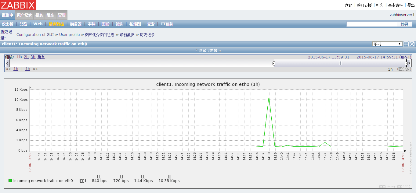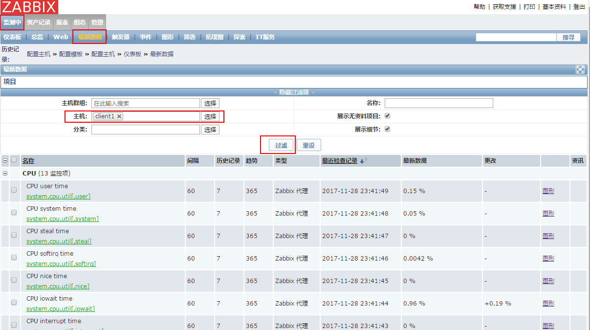 点击"监测中"标签,再点击"最新数据"子标签,在"主机"筛选框里输入client1,点击“过滤”按钮,即可以查看主机client1的最新数据: