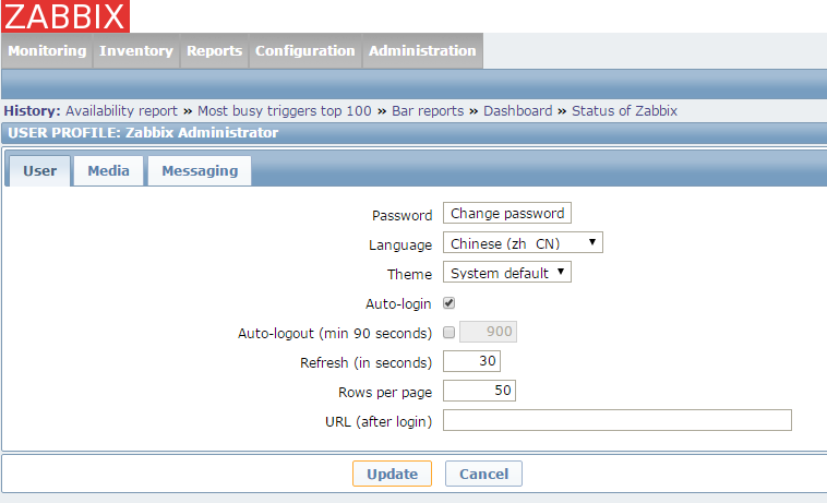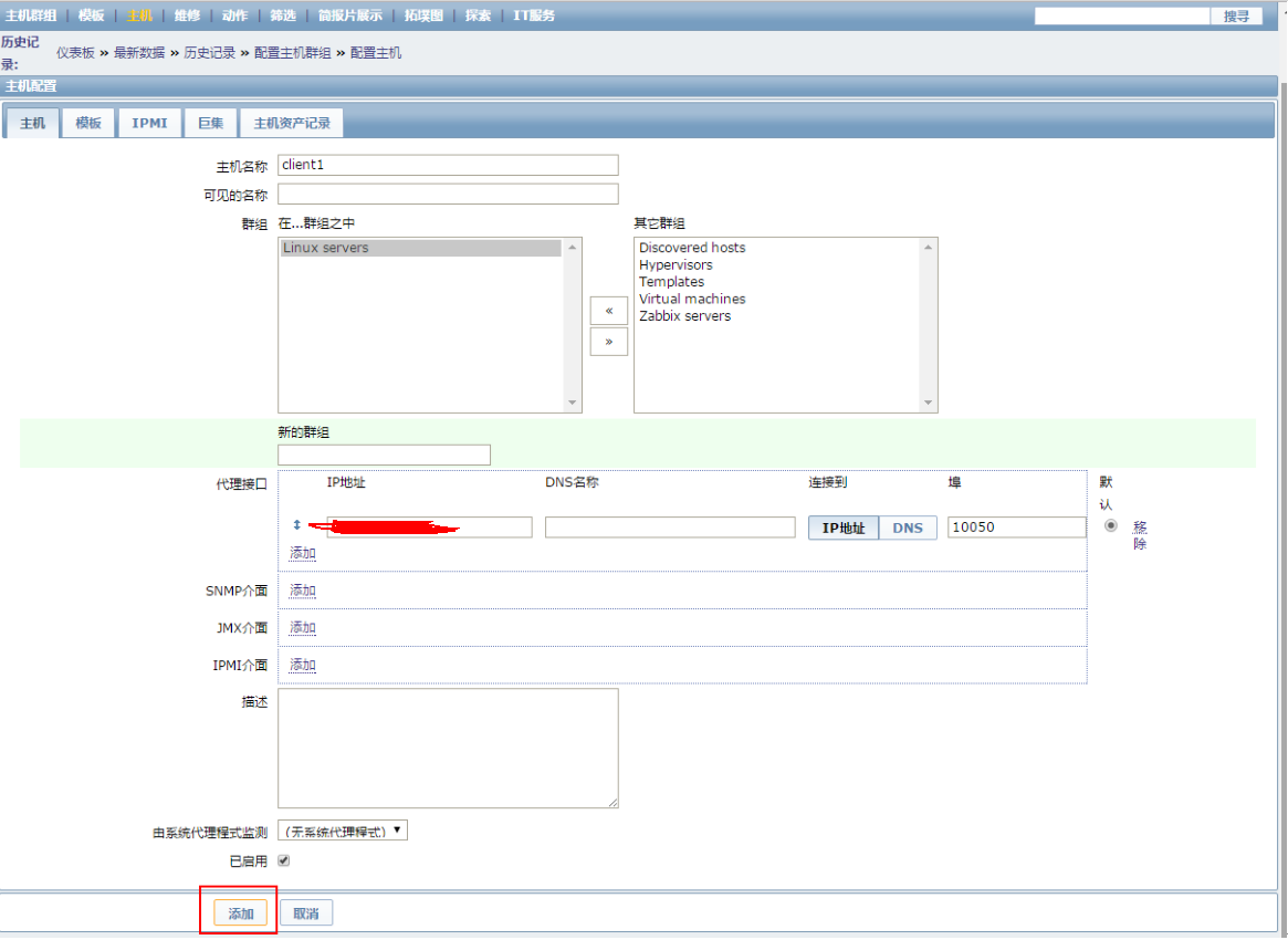 点击“添加”按钮,将选择的模板关联到这台主机,然后点击“更新”按钮,更新主机配置,