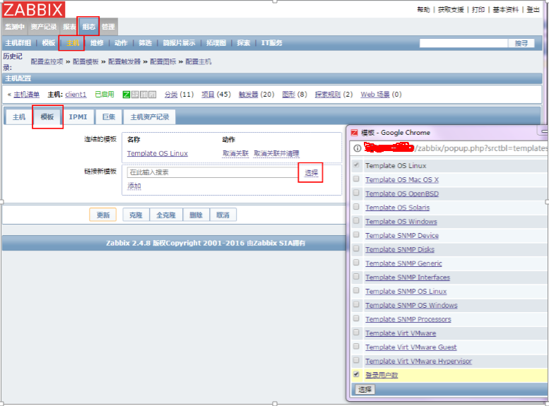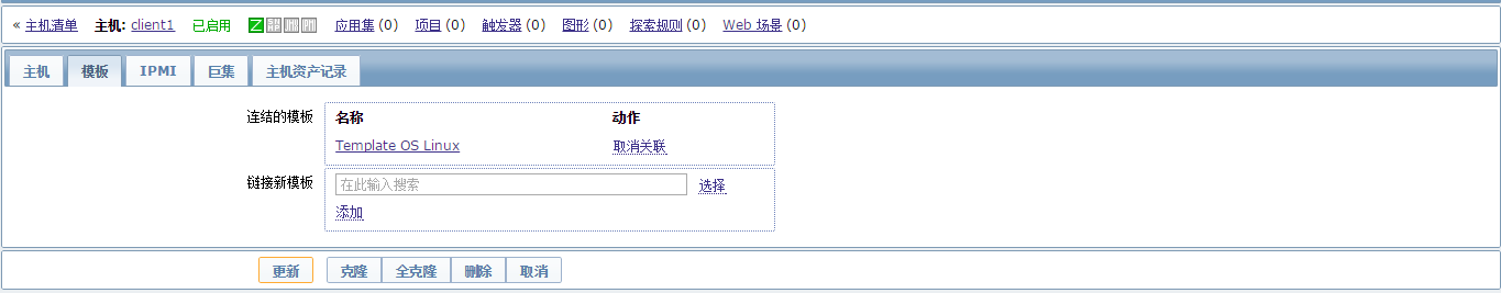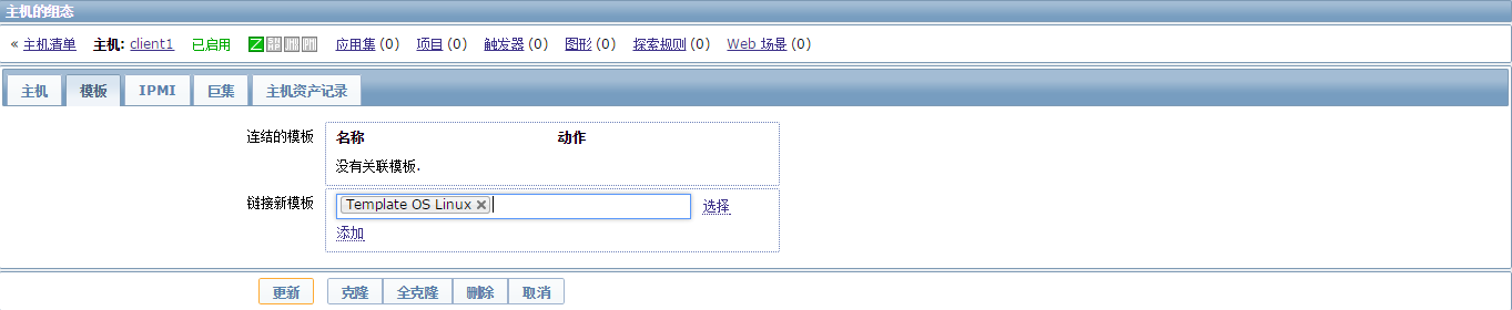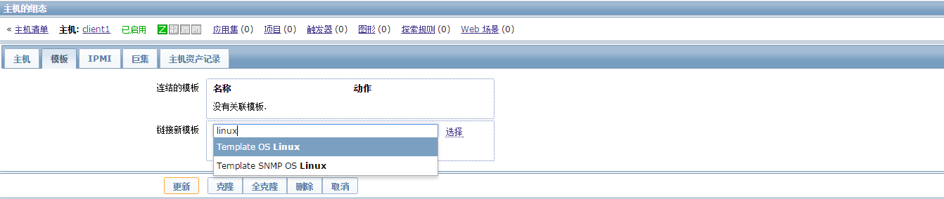 点击主机名“client1”,进入主机配置界面,点击“模板”标签,在“链接新模板”右侧的文本框里输入linux系统会智能匹配包含linux的模板: