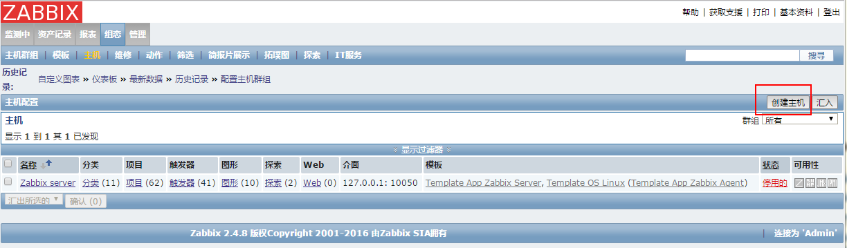 到server控制台页面,点击组态->主机,现在只有一台主机