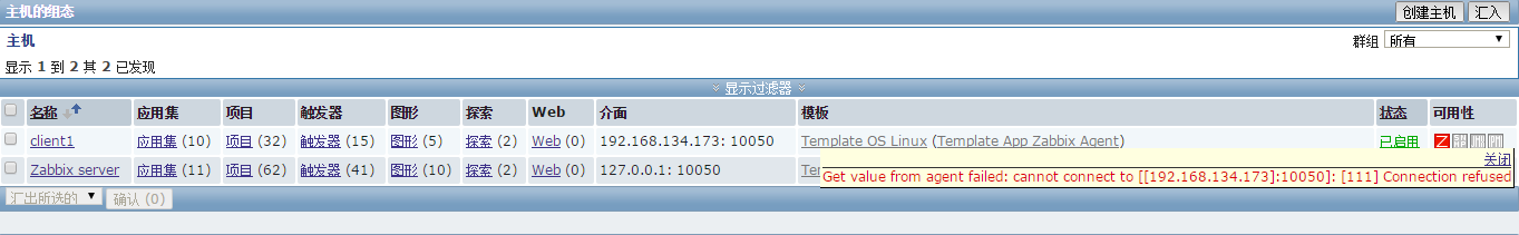如果右侧“可用性”的Z图标变成红色,表示ZabbixAgent连接失败,鼠标点击红色Z图标,可以看到详细错误信息
