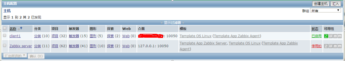 在主机列表里可以看到,主机client1已经有关联的模板,且应用集,项目,触发器,图形,探索等都有数字,(数字表示该项里包含的条目数量)