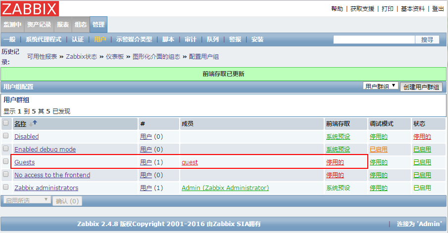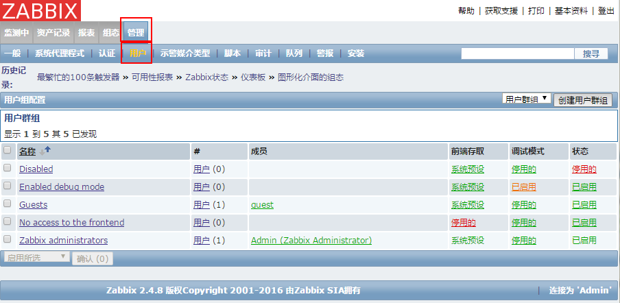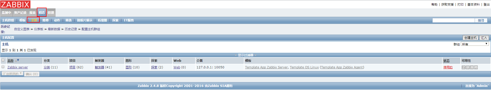【注】这里的ZabbixServer自身没有启动Zabbix Agent进程,所以启用后会看到红色的Z。