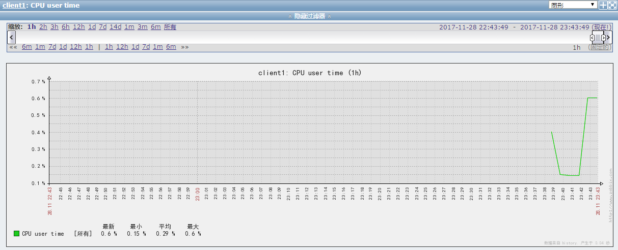 被监控的客户端收集到的数据在Zabbix Server Web控制通常会有两种显示形式,数据或图形。数据类通常是某些固定值或日志内容,如主机名称,操作系统版本等“文本”类型的数据;图形是将定期收取的"数值"类型数据绘制成曲线图。获取数据要等待若干周期,周期越长,获取的数据越多,数据或图形越详实。