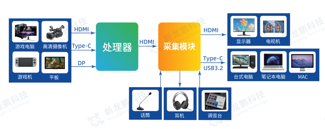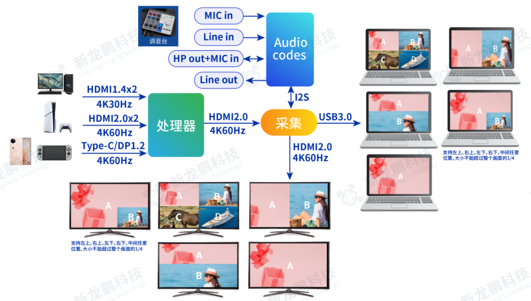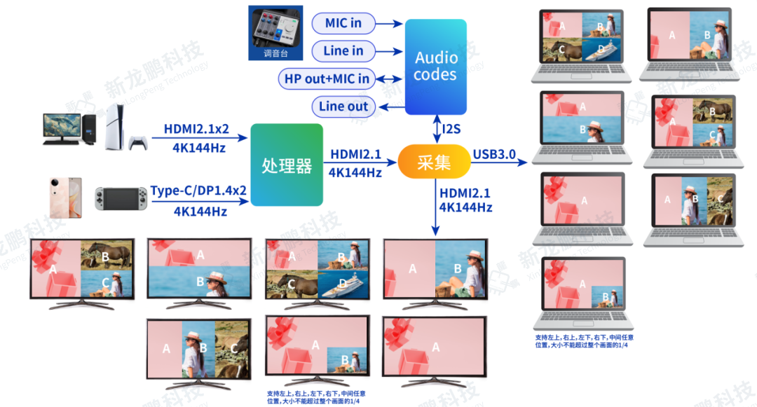 1、音视频采集卡应用示意图 2、4K60多画面采集卡方案 支持多画面录制 支持多画面环出 支持PIP/PBP,1P/2P/4P 3、4K144多画面采集卡方案 支持多画面录制 支持多画面环出 支持PIP/PBP,1P/2P/3P/4P