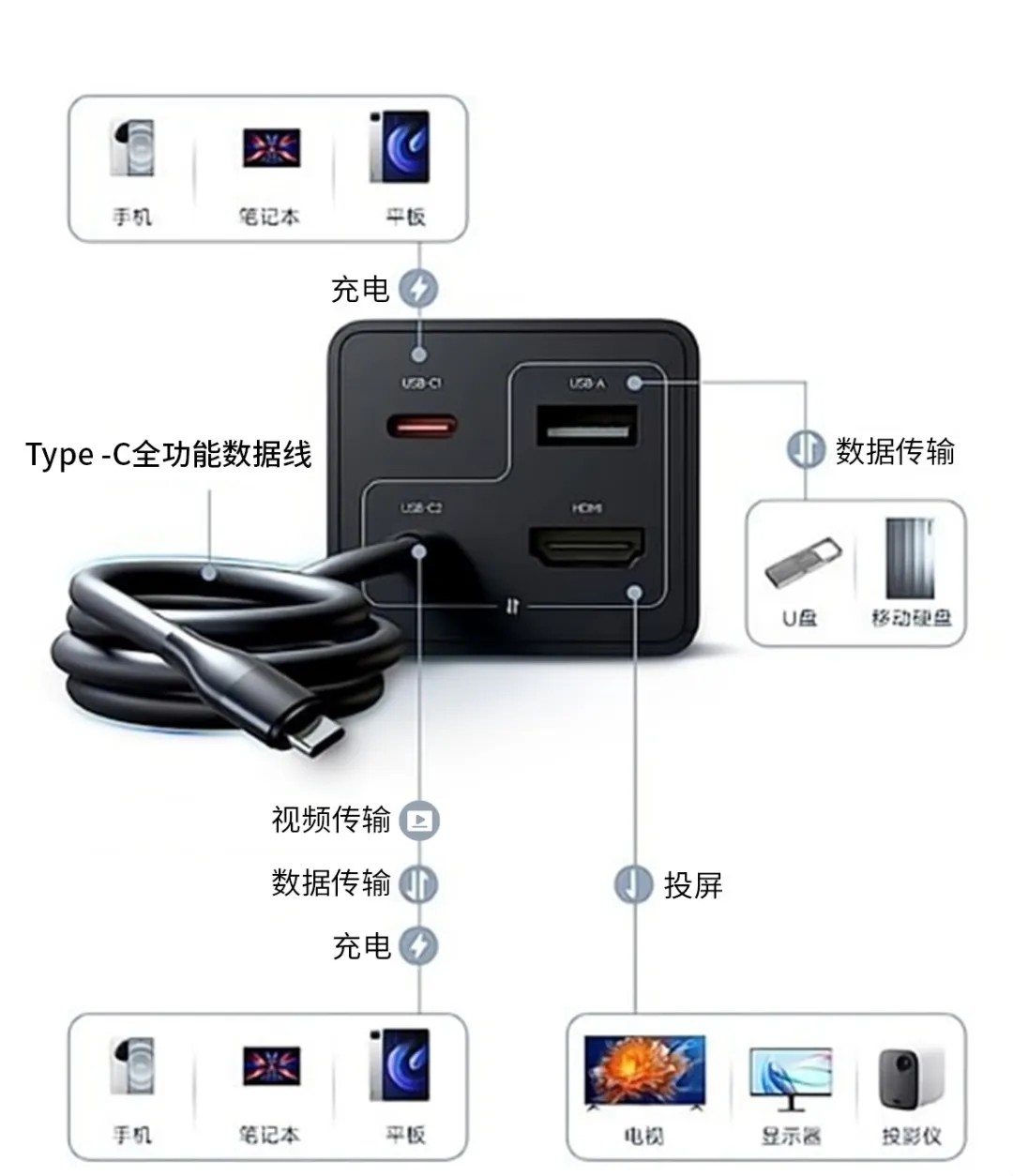 在忙碌的出差旅途中,经常需要带上笔记本、平板、相机、镜头、闪光灯、三脚架..还有一堆烦人的充电设备,而桌面快充插座集合了快充、HDMI高清投屏、USB数据传输、设备供电,很高效和智能的解决了很多烦恼,成为出差办公外带的优秀产品,当然也不仅仅是出差才能用到。