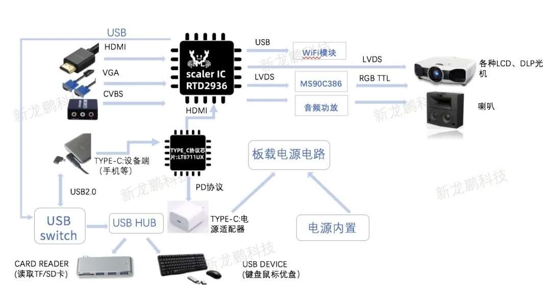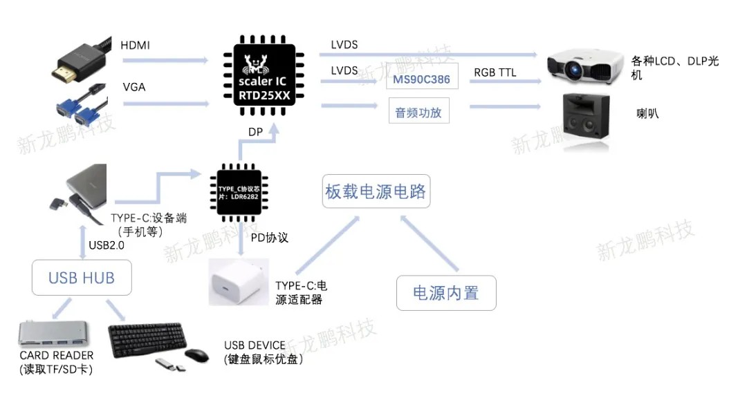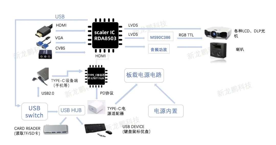 - HDMI,VGA,Type-c,CVBS多种信号输入以及USB播放