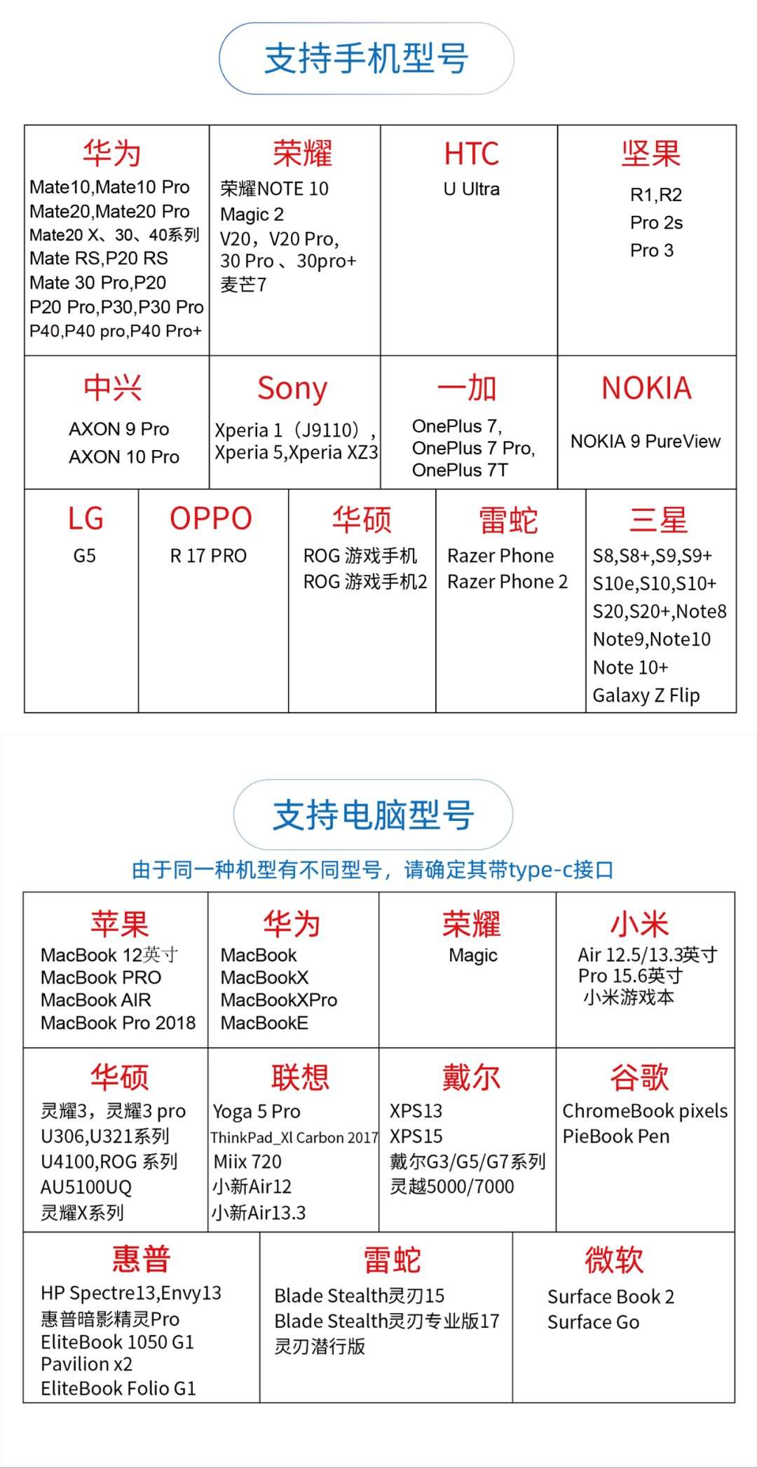 - 支持的Type-c信号源设备已覆盖电脑,手机,平板,游戏机等各类应用;