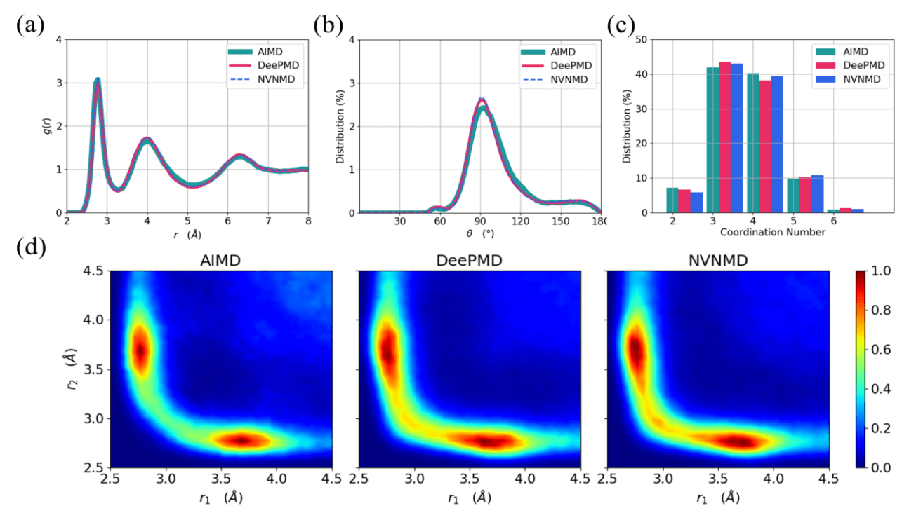 从不定形态的仿真轨迹中提取出了GeTe的径向分布函数、角度分布函数、配位数以及ALTBC(angular-limited three-body correlation)。这里的ALTBC是考察了Ge-Te-Ge和Te-Ge-Te键大于155°的构型(Ge-Te键长)组合分布,是对GeTe微结构特性的有效观测手段,结果如图所示。